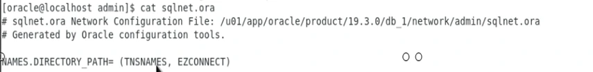 Veamos su contenido con el comando "cat sqlnet.ora". En el archivo se configura primero el modo TNSNAMES, seguido del modo EZCONNECT, que es más rápido en esta versión.